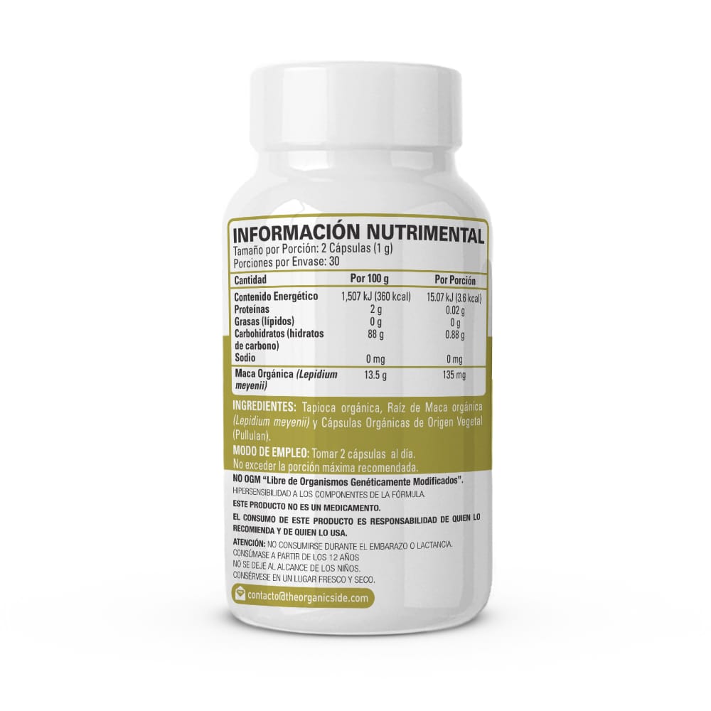 Tapioca orgánica, Raíz de Maca Orgánica (Lepidium meyenii) y cápsulas Orgánicas de Origen Vegetal.